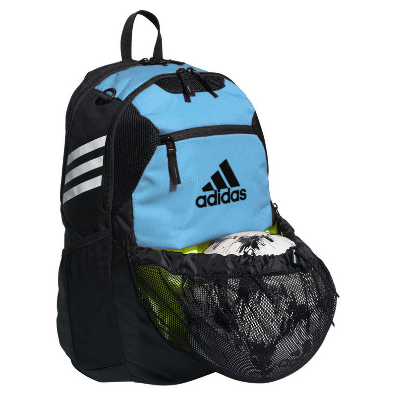 Easily carry your gear to and from the field with the adidas Stadium 3 backpack. This was designed with soccer players in mind and is made from recycled polyester fabric. The base is water-resistant to help keep gear dry while a ventilated pocket airs out dirty gear, but it is secured with a zipper closure. Side pockets are made from mesh and can support up to 32-ounce water bottles. Stash a size 5 soccer ball in an exterior mesh pocket or a zippered pocket. This black soccer backpack features a light blue accent panel and features space for embroidery. WARNING: Products may contain chemicals known to the state of California to cause cancer, birth defects, or other reproductive harm. See www.P65Warnings.ca.gov for more info. |